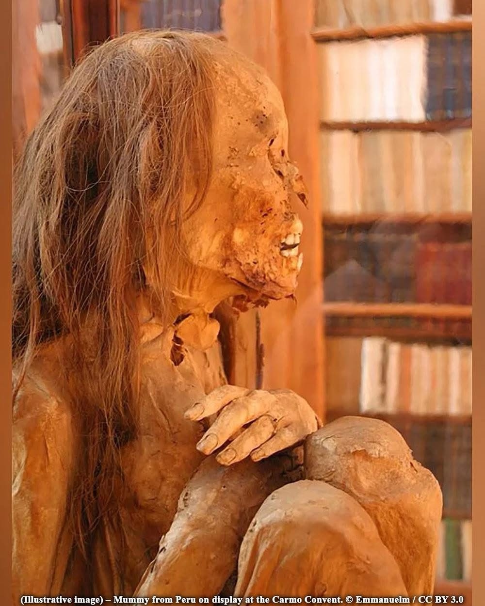 The mummy was found in a seated, fetal position and wrapped in textiles, a burial style characteristic of ancient Andean funerary practices.