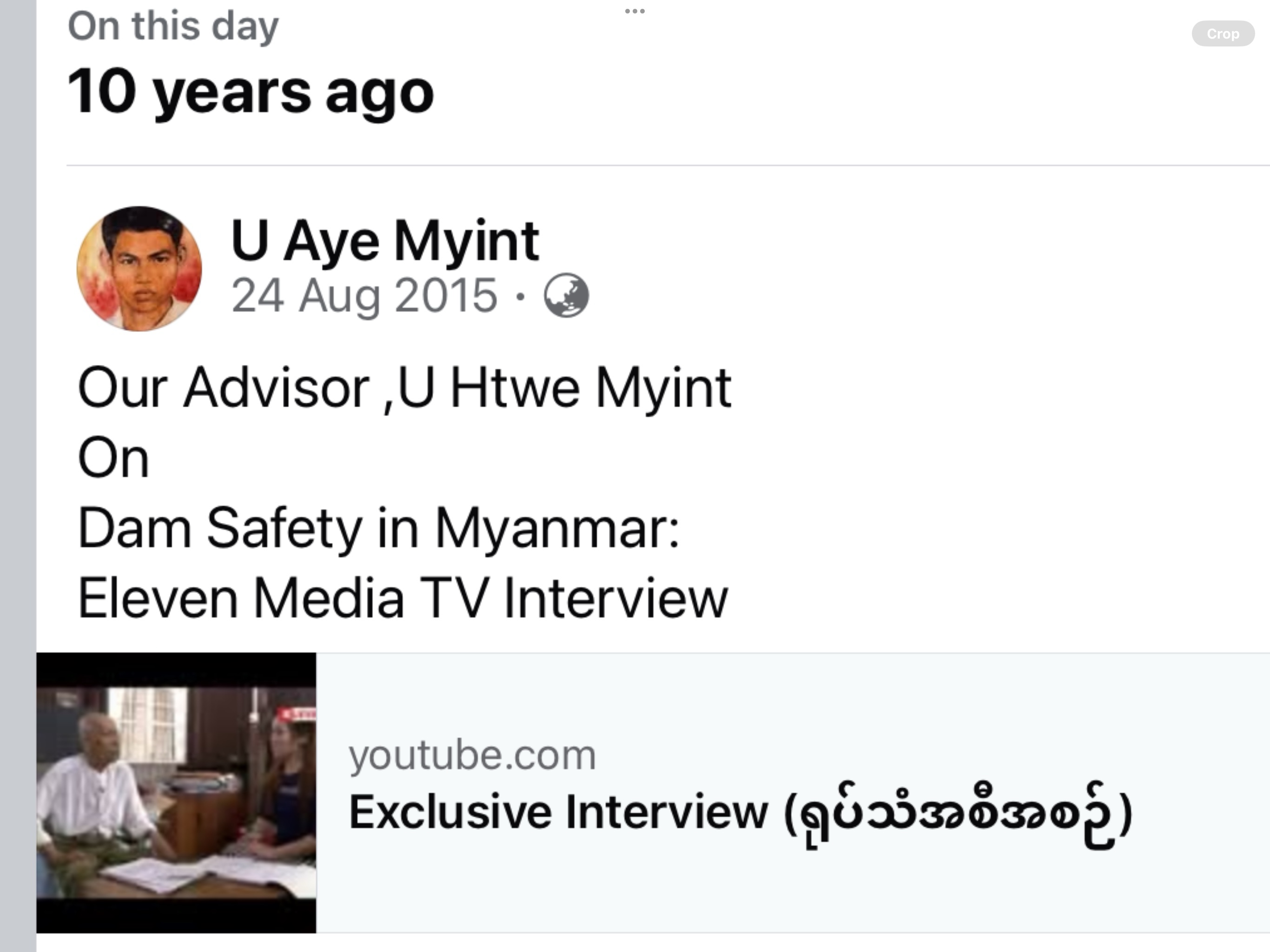 မြန်မာပြည် ဆည်တမံများဘေးကင်းလုံခြုံ စိတ် ချ ရေးအတွက် သတိထားစရာများ ကို Eleven Media TV Interview တွင် နိုင်င့အနာဂတ် ဆည် မြောင်းရေးရာများအတွက် ဘက်မလိုက်ဘဲ အားမနာတန်း မကွယ်မထောက် ထောက်ပြပြောပြဿွားခဲ့သူ ကွယ်လွန်သူ ဆည် မြောင်း ဆရာသမား ၊ ဝါရင့် စီနီယာ အင် ဂျ င်နီယာကြီး။ ဦးထွေးမြင့်နှင့်အင်တာဗျူး ရုပ် သံ သတင်း ။ Our Advisor ,U Htwe Myint