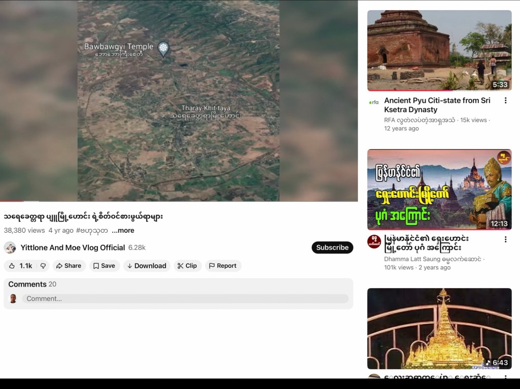 ပျူတွေအကြောင်း။ လက်လှမ်းမှီသမျှ ပျူလူမျိုးတွေ အကြောင်းကို သူတို့ရဲ့ အစဖြစ်တည်မှု၊ မြို့ပြဟောင်းတွေ၊ ထင်ရှားတဲ့ယဉ်ကျေးမှု နဲ့ အနုပညာတွေ၊ ဘယ်လိုပျောက်ကွယ်ခဲ့သလဲ၊ တရုတ်မှတ်တမ်းက ဖော်ပြထားတဲ့ သူတို့အကြောင်းတွေကို စုစည်းတင်ပြထားပါတယ်။ https://youtu.be/Saa0G8v1vYQ?si=5mQNz1NOu691ucBA