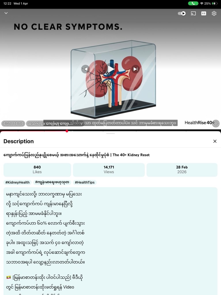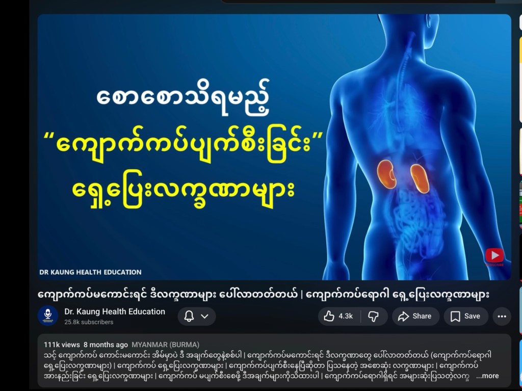 ဒီနေ့ ဗီဒီယိုလေးမှာတော့ ကျွန်မတို့ ခန္ဓာကိုယ်ရဲ့ အရေးကြီးဆုံး အစိတ်အပိုင်းတစ်ခုဖြစ်တဲ့ “ကျောက်ကပ်” ကို ကျန်းမာသန်စွမ်းစေပြီး ရောဂါဘယတွေကနေ ကြိုတင်ကာကွယ်ပေးနိုင်မယ့် သဘာဝ အစားအစာ (၇) မျိုးအကြောင်းကို အသေးစိတ် ရှင်းလင်းတင်ဆက်ပေးထားပါတယ်။ ကျောက်ကပ်ဟာ အသံတိတ် အလုပ်လုပ်နေတဲ့ အင်္ဂါဖြစ်လို့ ရောဂါမဖြစ်ခင် ကြိုတင်ဂရုစိုက်ဖို့က အရမ်းကို အရေးကြီးပါတယ်။ ဒီဗီဒီယိုလေးကို အဆုံးထိ ကြည့်ရှုပြီး မိမိနဲ့ မိသားစုရဲ့ နေ့စဉ်စားသောက်မှုပုံစံမှာ ထည့်သွင်းစားသုံးကြည့်ဖို့ အကြံပြုချင်ပါတယ်ရှင်။