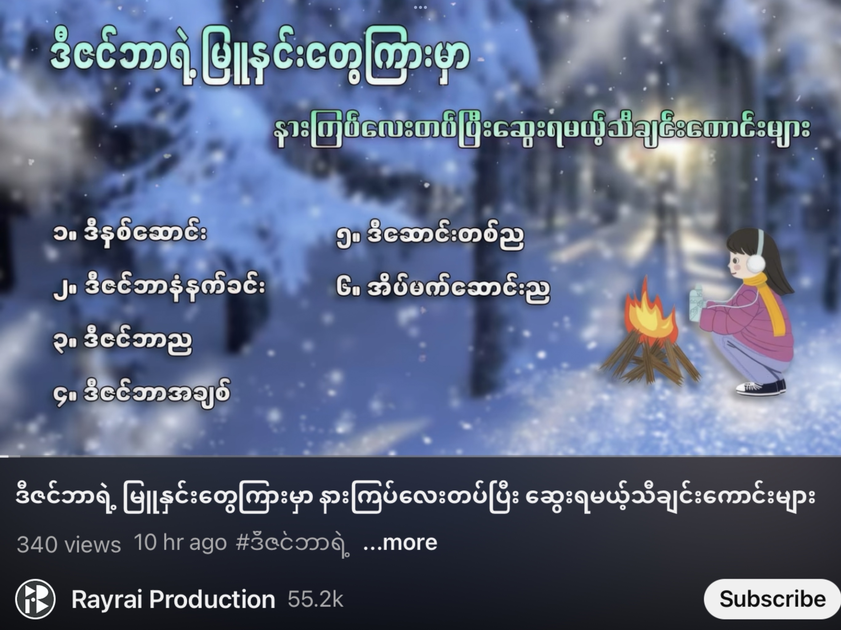 ဒီဇင်ဘာရဲ့ မြူနှင်း တွေကြားမှာ နားကြပ်လေးတပ်ပြီး ဆွေးရမယ့် သီချင်းကောင်းများ။ https://youtu.be/h6L1c07zlF4?si=f-KLJQyPqXNTL-mb