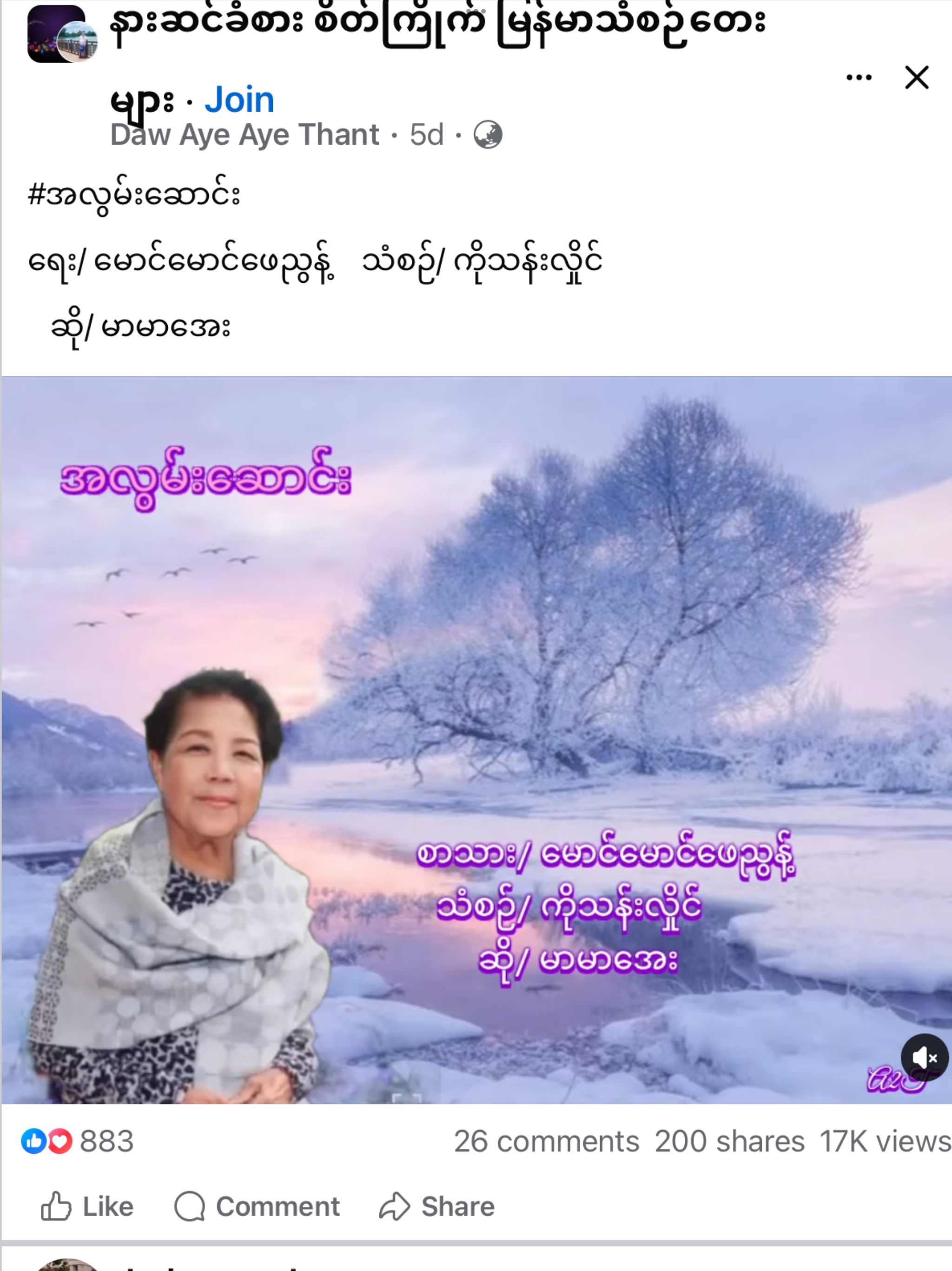 မာမာအေးဆို နှင်းရတု လပြာသို https://m.facebook.com/groups/1768866713389020/permalink/4956568347952158/? ဂီတစာဆိုကိုလေးညွန့်