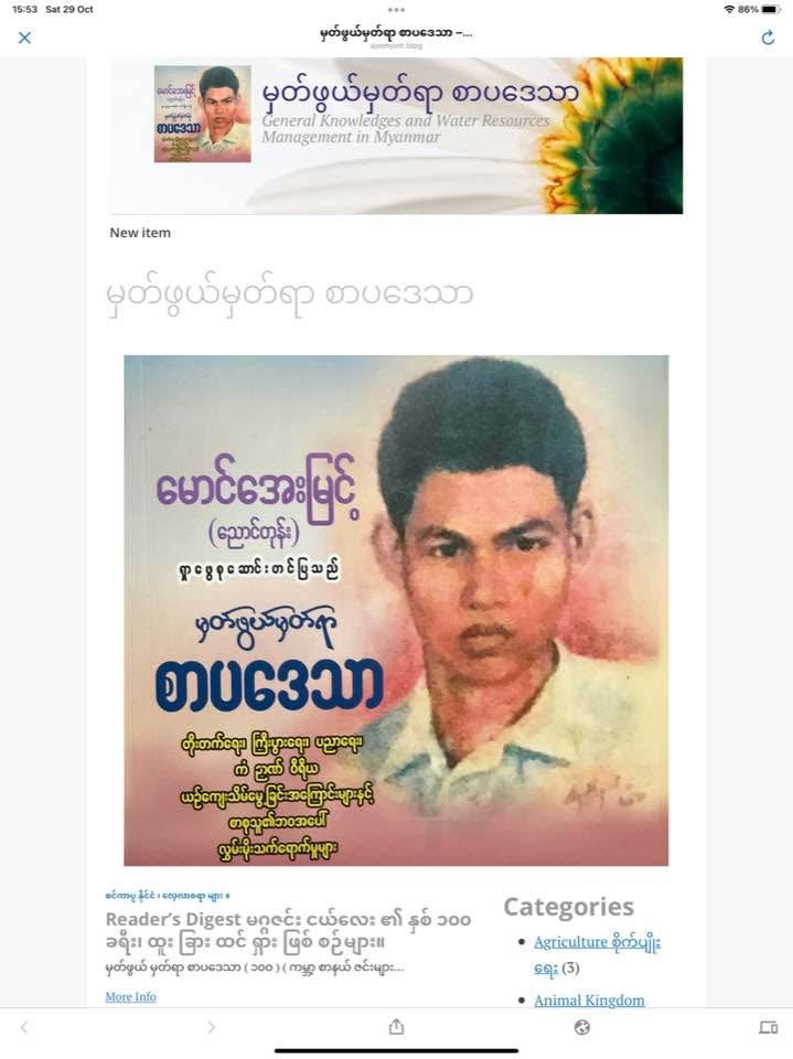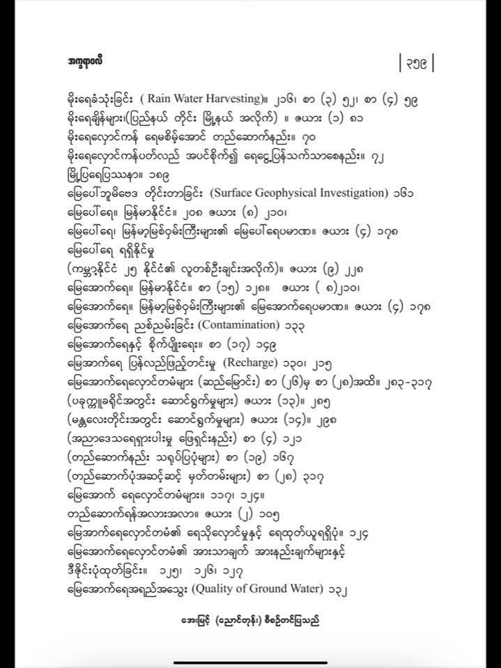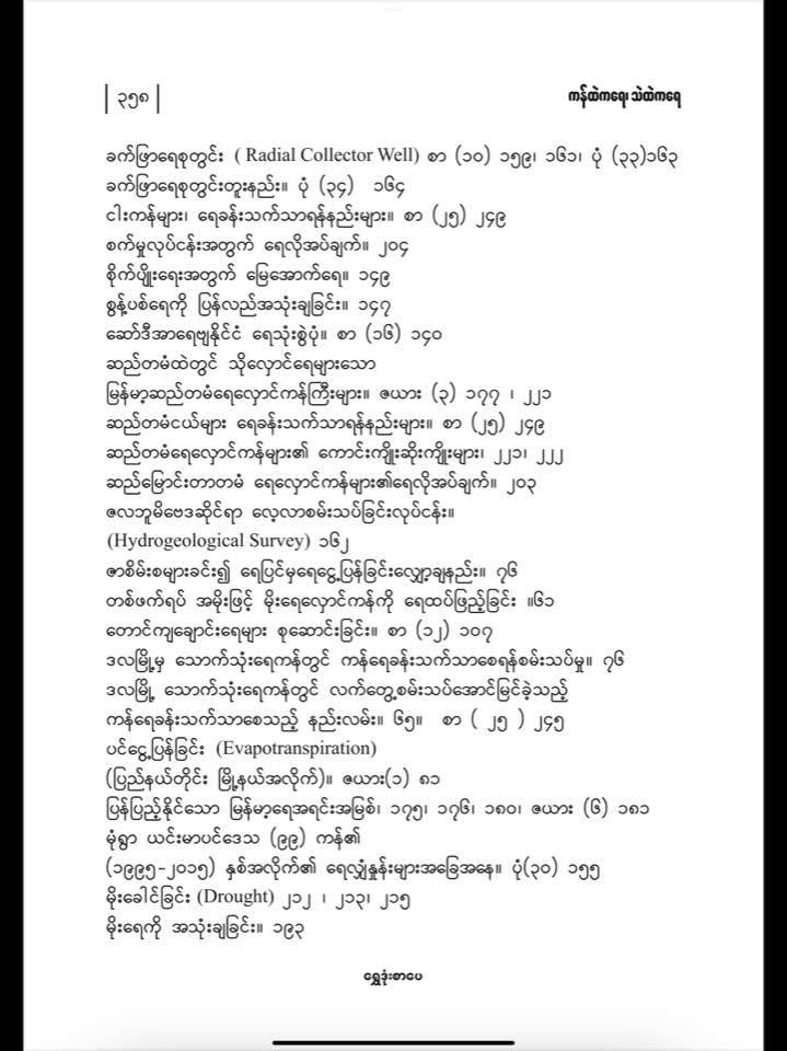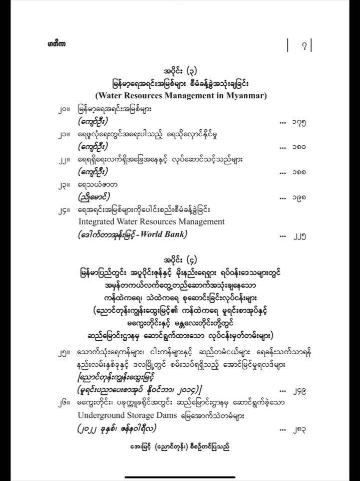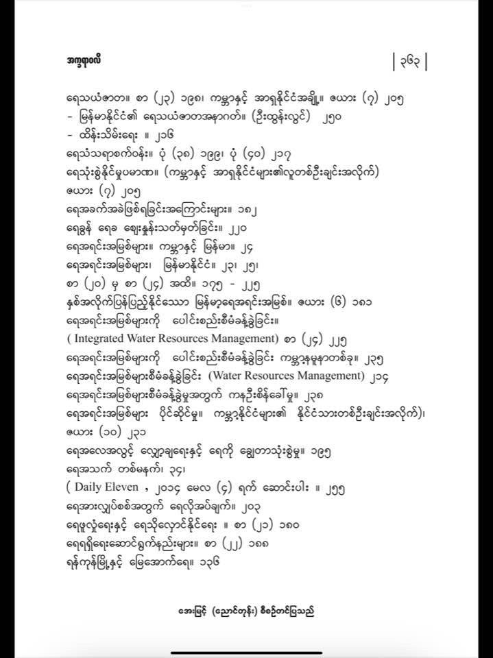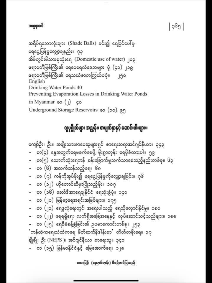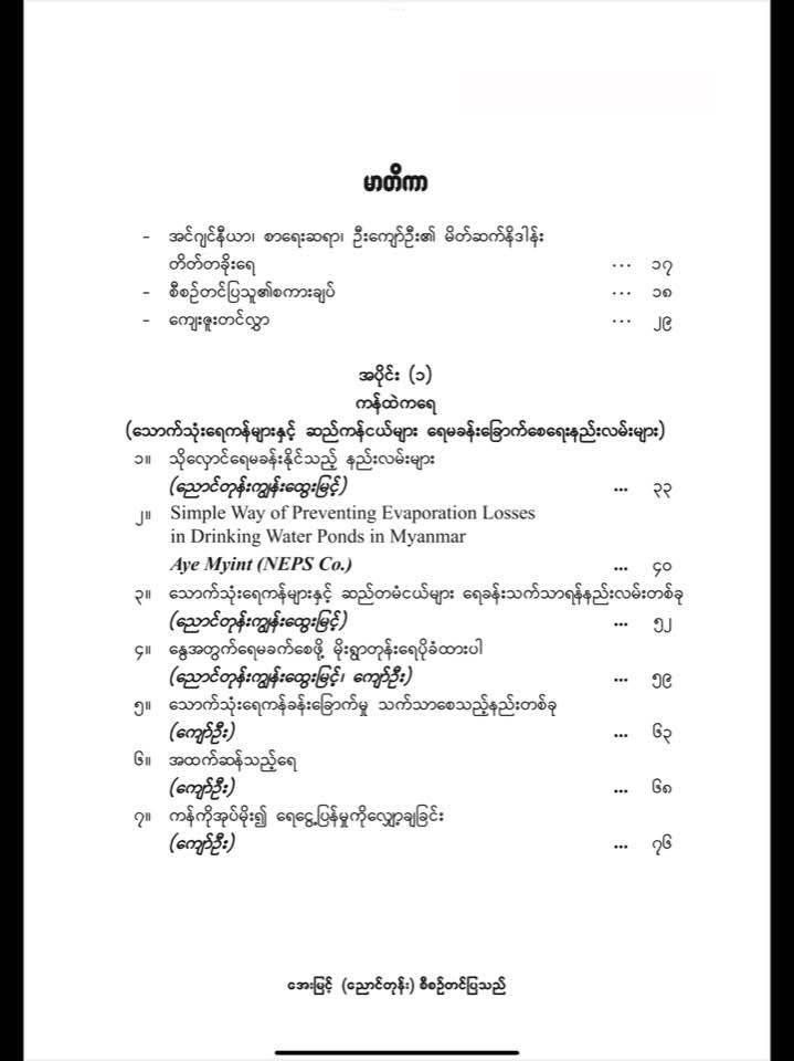 ရည်ညွှန်းစာအုပ်။ ရွှေဒုံး စာပေမှ ဖြန့် ဝေ ခဲ့သည့် နိုင်ငံတော်ပြည်အရေး ရေအရေး ၊ ရေရေးရာ အတွက် အေးမြင့်(ညောင်တုန်း ) စုစည်း စီစဉ်တင်ပြ ခဲ့ သည့်။ ရွှေဒုံး စာပေမှ ထုတ် ဝေ ဖြန့် ဖြူး ခဲ့သည့် ရေအရင်း အမြစ် စီမံ ခန့်ခွဲရေး စာအုပ်။ နွေအတွက် ရေမခက်စေဖို့ ကန်ထဲက ရေ ၊သဲထဲကရေ စာအုပ်။ စာအုပ် အကြောင်း သိကောင်းစရာများ။ စာအုပ်တွင်ပါဝင်သည့် မြေပေါ် မြေအောက် ရေ စုဆောင်း ရေး နည်းပညာများ။ ပါဝင်သည့်အကြောင်းအရာများကြည့်ရန်။ ayemyint.blog အင်တာနက်စာမျက်နှာ ထဲမှ စာအုပ်အကြောင်းနှင့် မာတိကာ အခနိးစဉ်များ၊ မိမိသိရှိလိုသော ရေရေးရာ အကြောင်းအရာများ။ အလွယ်တကူရှာဖွေနိုင်သည့် အက္ခရာစဉ် မာတိကာ အညွှနိးများ