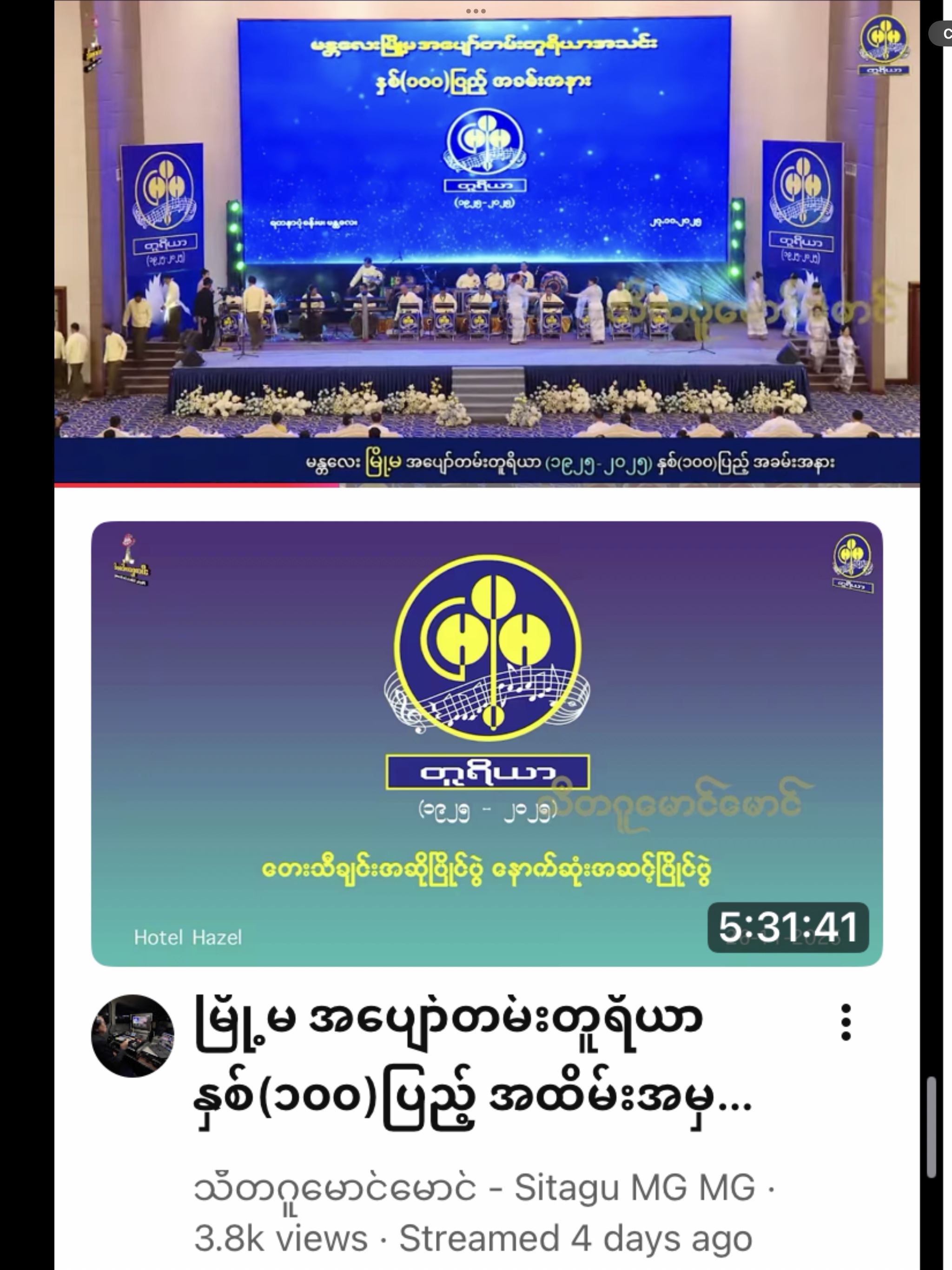 မန္တလေး မြို့မ အပျော်တမ်းတူရိယာ။ (၁၉၂၅-၂၀၂၅) နှစ်(၁၀၀) ပြည့် အထိမ်းအမှတ် တေးသီချင်ူ အဆိုပြိုင်ပွဲ နောက်ဆုံးအဆင့် ပြိုင်ပွဲ။ https://www.youtube.com/live/ffyFMWtSRgg?si=ZTGiB8axS_VyLiOF