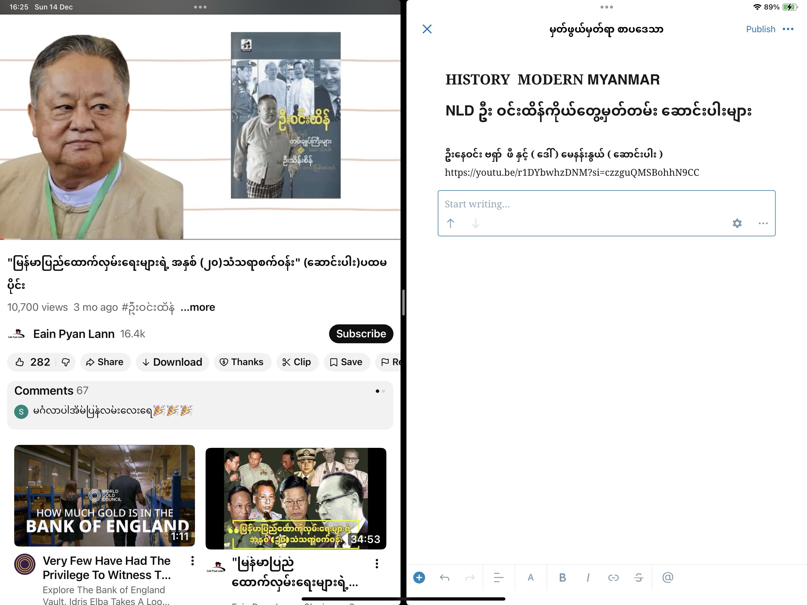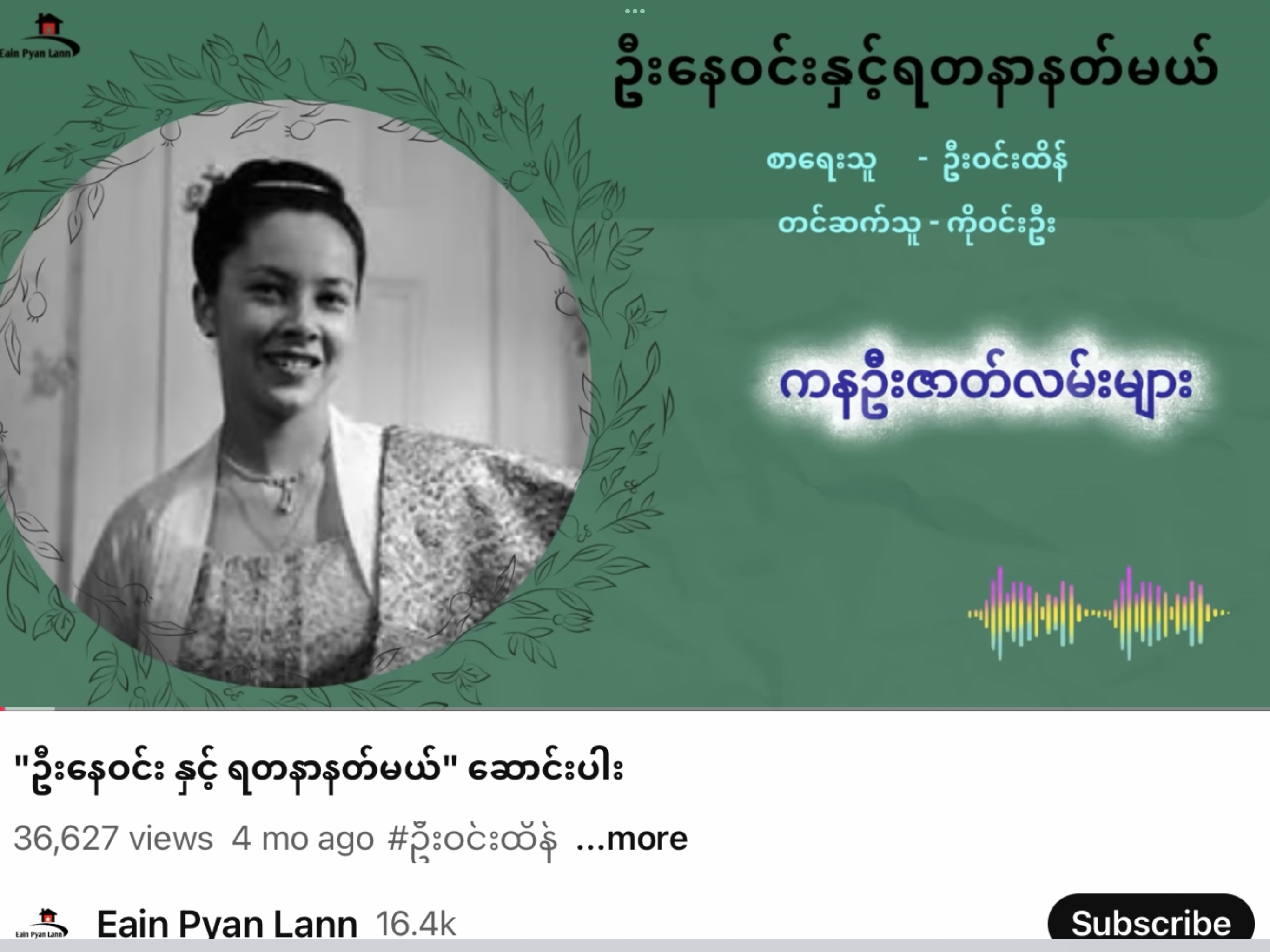 သူတို့နှင့် ကျွန်တော် -ဦးဝင်းထိန် https://youtu.be/KRmX6scFUnU?si=stnJ92FG5F2uHhCB ကျွန်တော်ကလည်း ကျွန်တော့်ဘဝသက်တမ်းတလျှောက် ရင်းနှီးခဲ့တဲ့ ပုဂ္ဂိုလ်အချို့ဟာ ဒီခေတ်ရာဇဝင် (သို့) ယခုခေတ် သမိုင်းမှာ အရေးပါ အရာရောက်တဲ့ ပုဂ္ဂိုလ်တွေဖြစ်ကြပါတယ်။ဒါကြောင့် သူတို့အကြောင်းကို ကျွန်တော်သမီသလောက် ရေးပြရခြင်းဟာ တချို့သော အကြောင်းအရာတွေက နောင်လာနောင်သားတို့ သိသင့်သိထိုက်တဲ့ သမိုင်းဝင်ဖြစ်ရပ်လေးတွေအဖြစ် မှီငြမ်းနိုင်စရာ အချက်အလက်လေးတွေဖြစ်လာနိုင်ပါတယ်။ဒါကြောင့် ကျွန်တော်နဲ့ ပက်သက်ဖူးခဲ့သူတွေအကြောင်း တတ်စွမ်းသမျှ ပြန်လည် ဖောက်သည်ချနေရတာပါ။တစ်ခုတော့ ကျွန်တော်သတိထားပါတယ်။ကျွန်တော်ရေးပြလိုက်လို့ တစ်ဖက်သား နစ်နာသွားစေမယ့် အဖြစ်မျိုး ကိစ္စမျိုးကိုတော့ ရှောင်ခဲ့ပါတယ်……… ဆက်လက်နားဆင်ပေးကြပါအုံးနော်