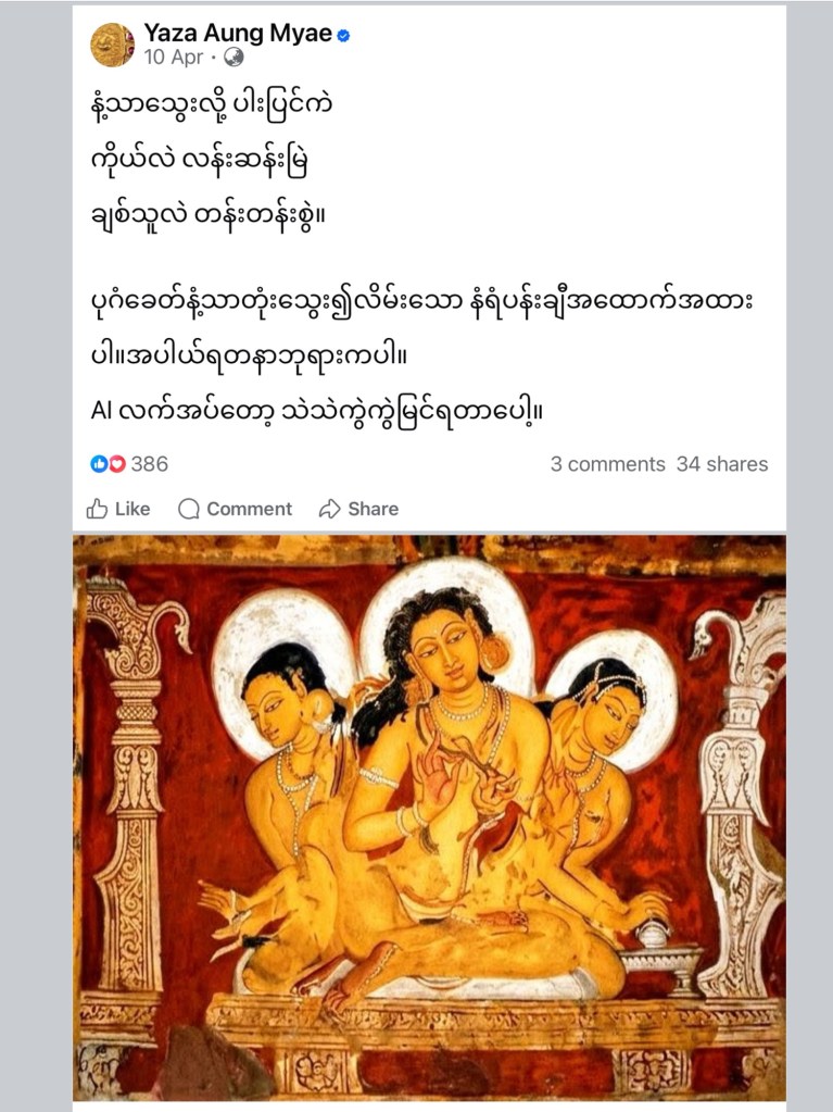 Khin Mg Win ကျေးဇူးတင်ပါတယ်ဗျာ။AIပေါ်လာတော့ ပုံတွေကိုအရင်ကထက်ပိုခံစားလို့ရလာပြီး အမွေအနှစ်ချစ်စိတ်ပိုလာဖို့၊ သိခြင်စိတ်တွေနဲ့သမိုင်းမှန်ကိုပိုပြီးတူးဆွလာဖို့၊ကိုယ့်အနုပညာရဲ့အတိမ်အနက်ကိုခန့်မှန်းနိုင်ပြီးဘယ်လိုဆက်ထိမ်းမလဲလို့စိုးရိမ်စိတ်ပေါ်လာဖို့ ရည်ရွယ်ပါတယ်ဆရာ။